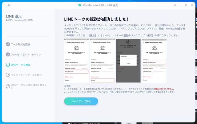 バックアップが取れたら、iCareFone for LINEに戻り、「バックアップ済み」をクリックします。